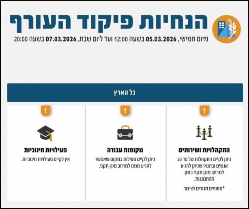 التجمعات (حتى 50 شخصاً): يُسمح بإقامة تجمعات تقتصر على 50 شخصاً كحد أقصى (سواء في الأماكن المفتوحة أو المغلقة)، ولكن بشرط أساسي وهو توفر إمكانية الوصول الفوري إلى مساحة محصنة قياسية (ملجأ أو غُرفة محصنة "مَمَد") خلال الوقت الزمني المحدد للإنذار في منطقتكم.